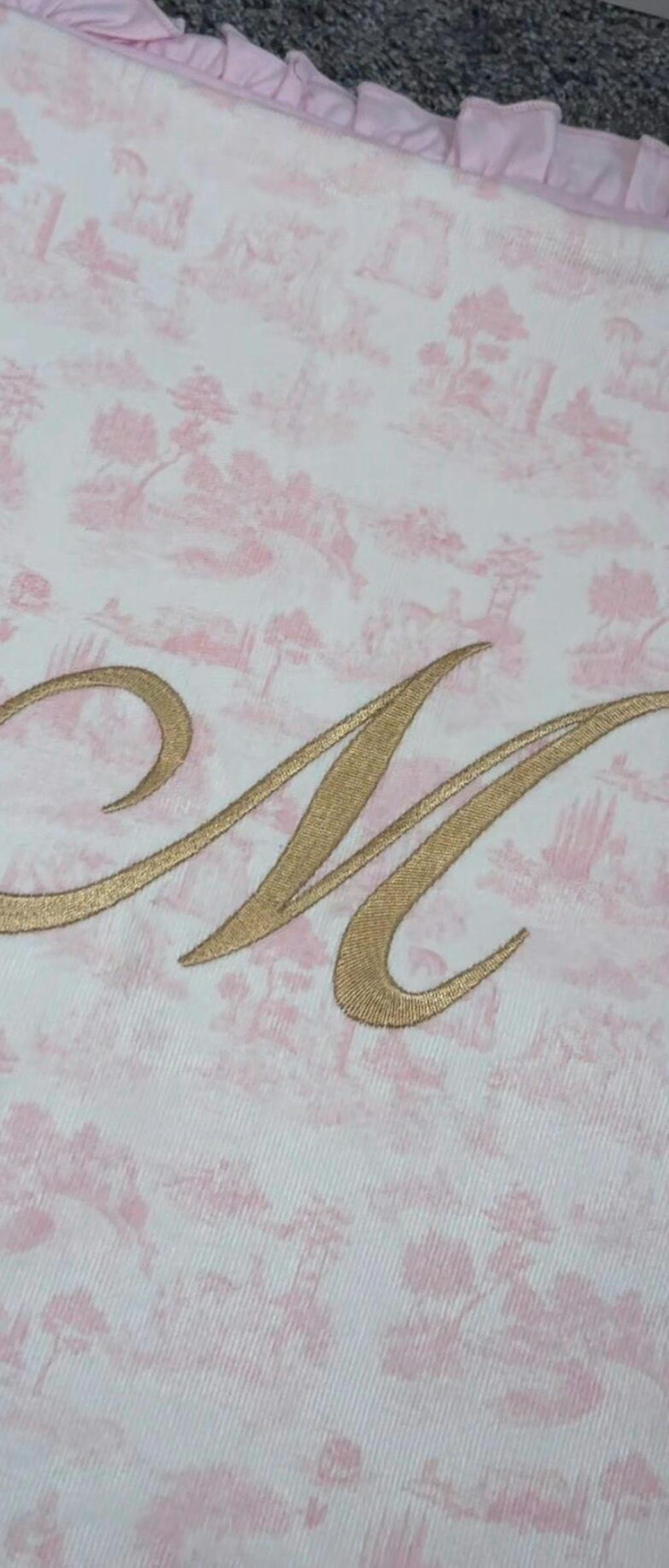 Embroidery is one large initial placed on the centre of the blanket in gold in our ballerina font. Click here to see our font guide