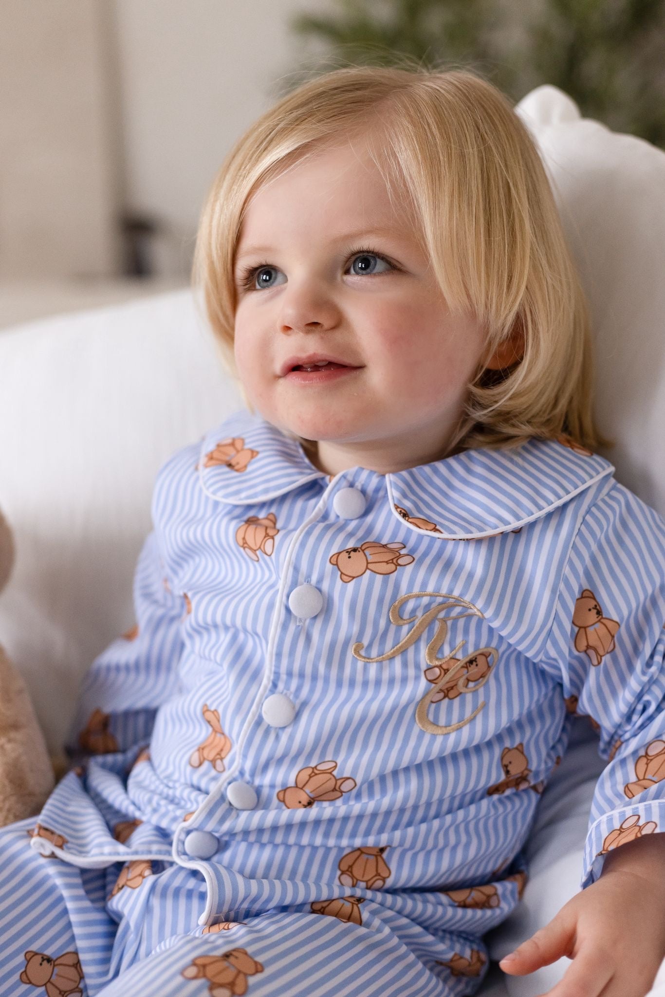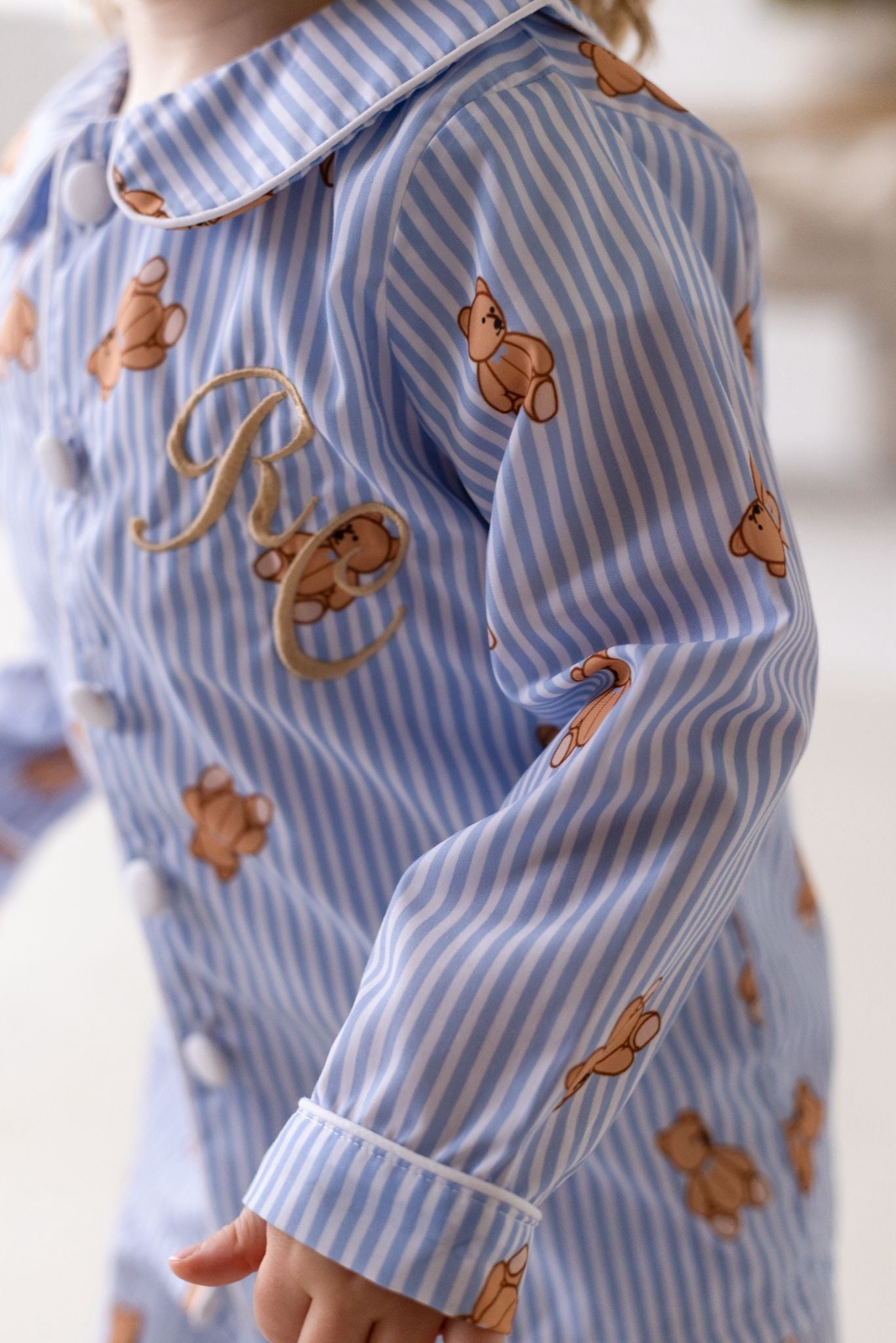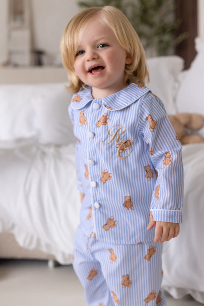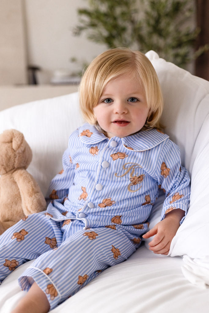 Boys Blue Stripe Teddy Bear Long Sleeve and Leg Pyjamas