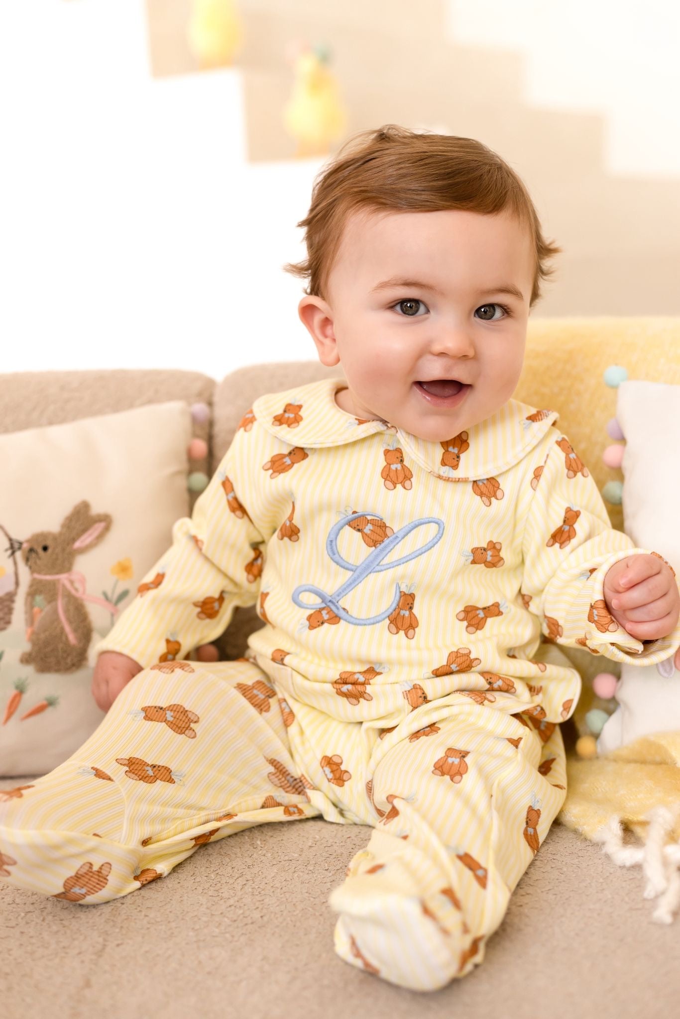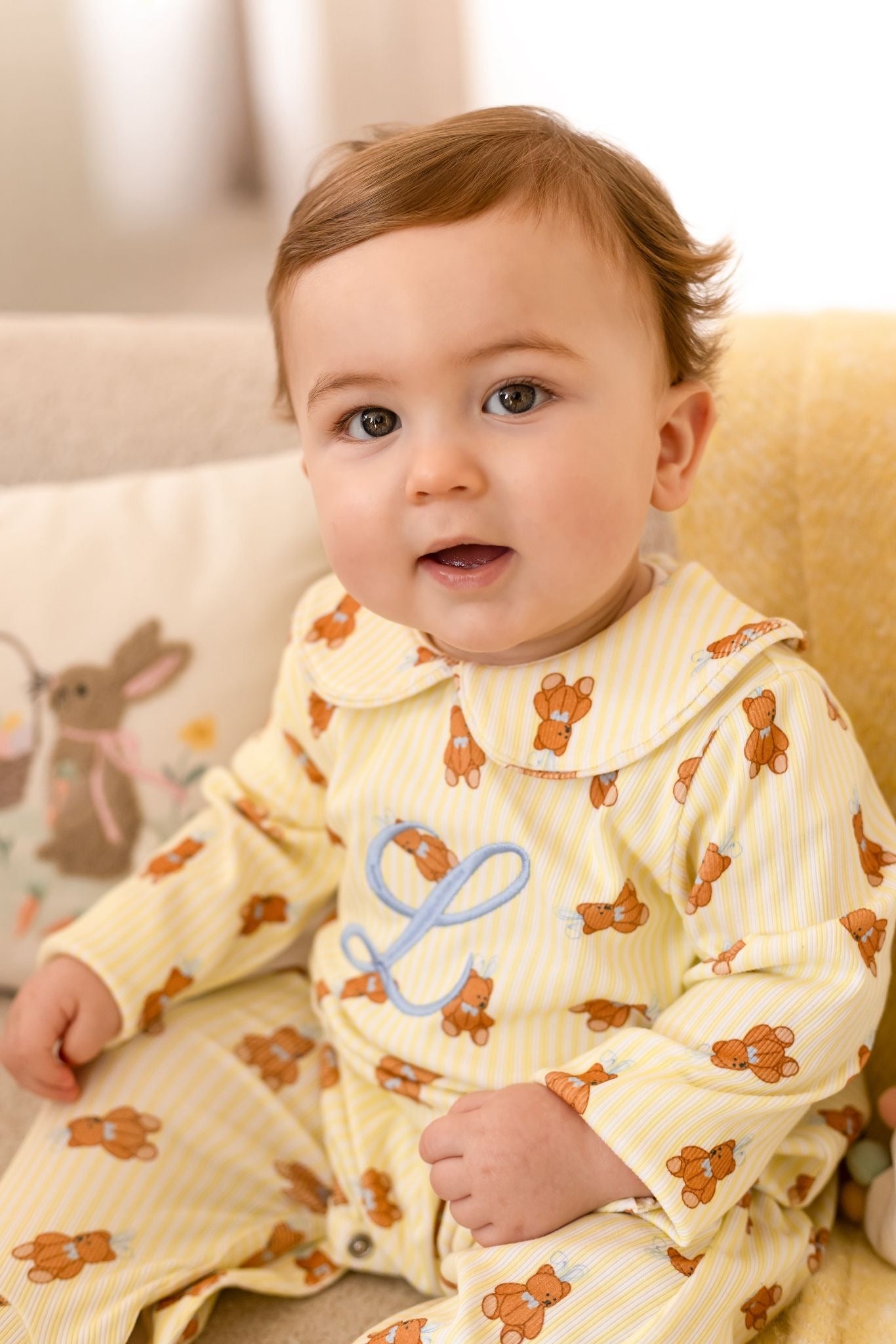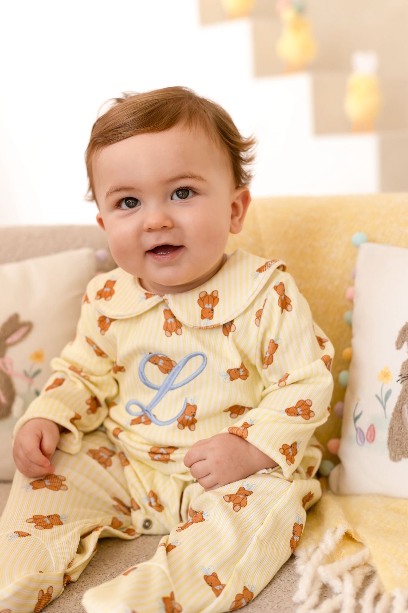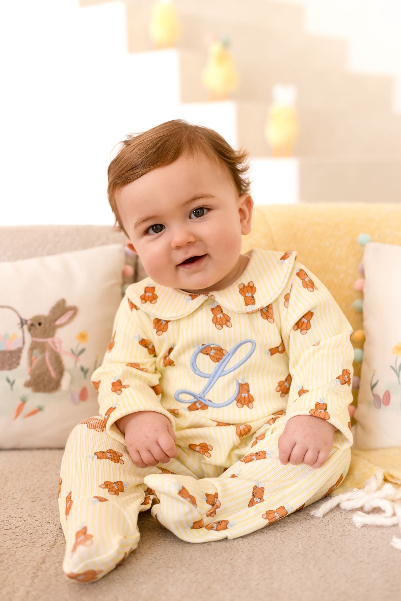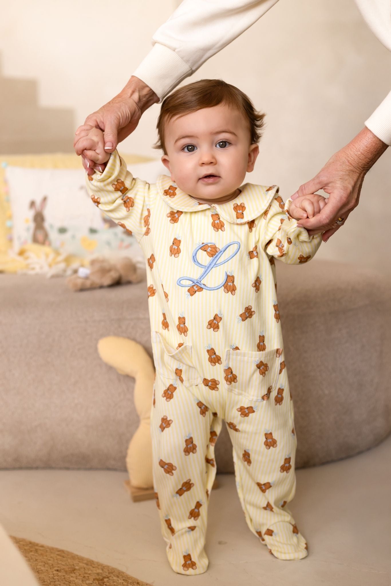 One large initial is placed on the chest of the babygrow in a complementary blue.