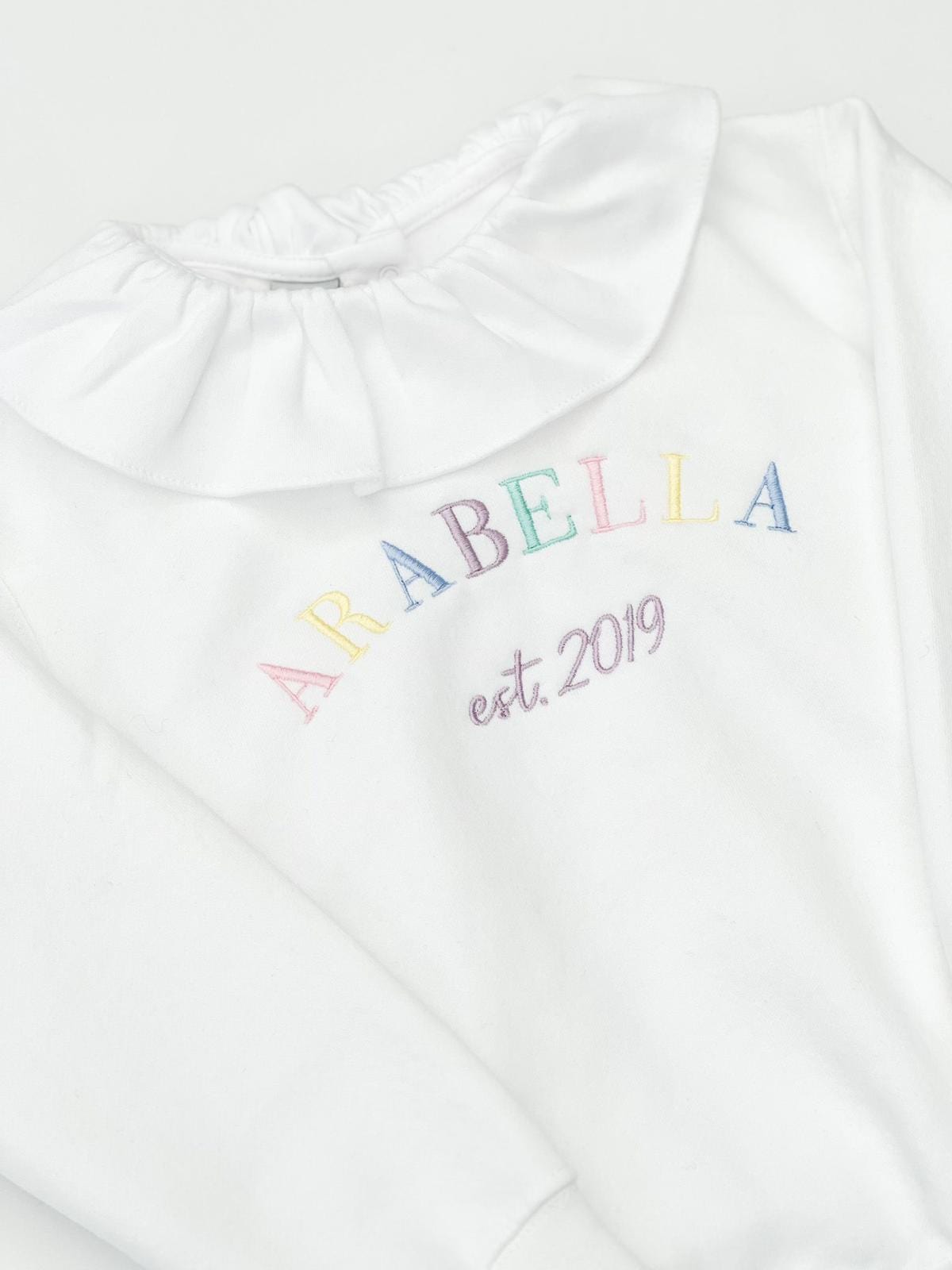 Font size will vary depending on the length of the name and the size of the item - please note the frill collar top under the sweater is sold seperately.