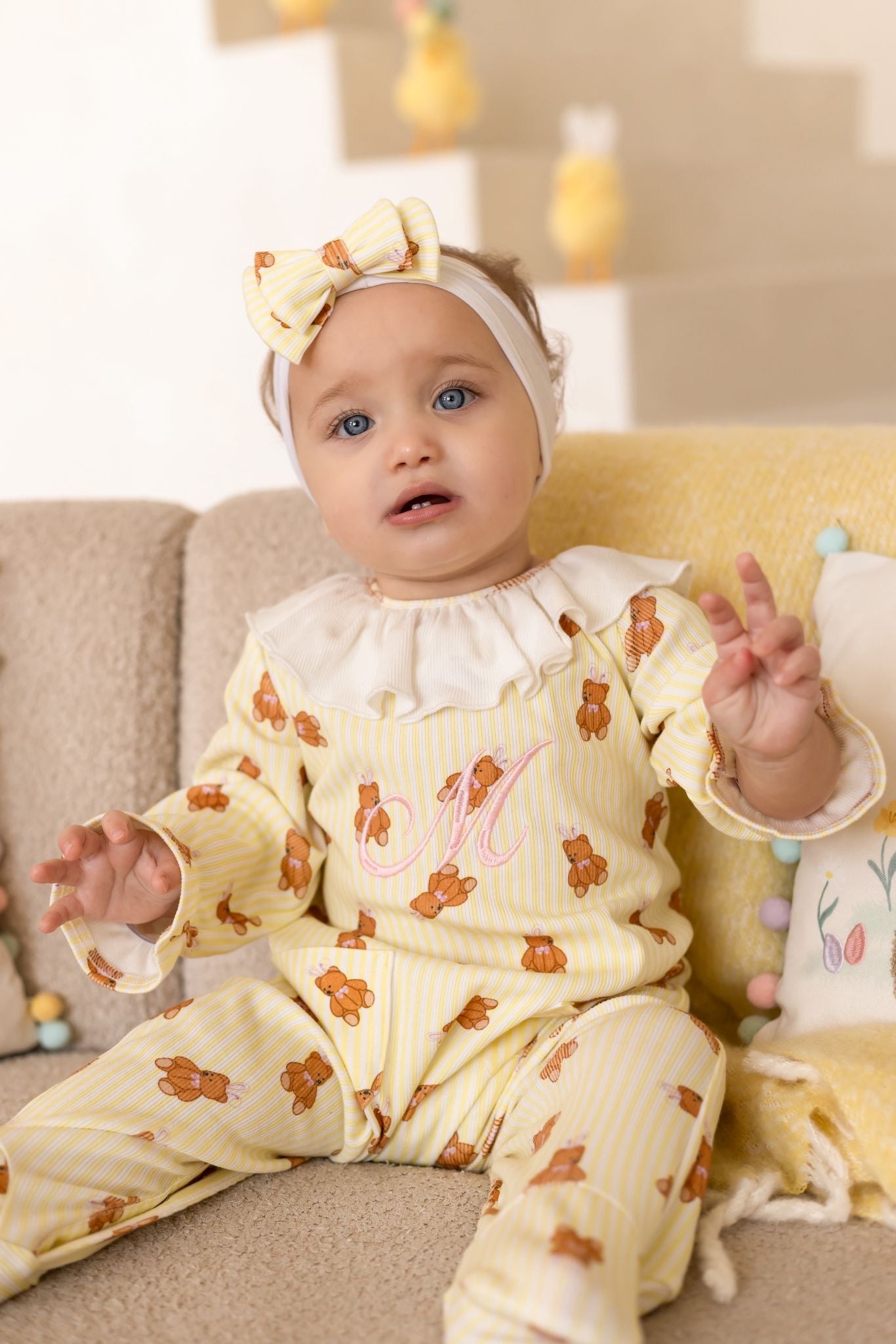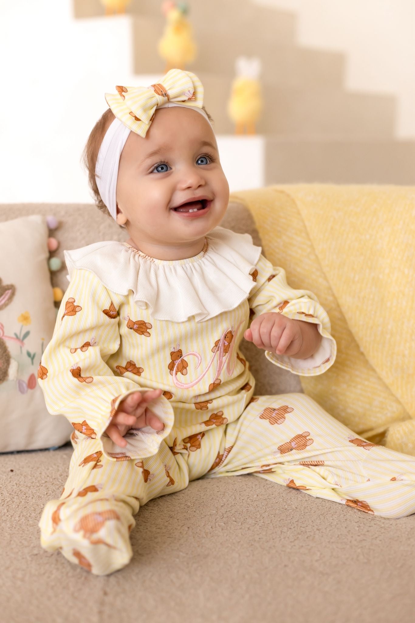 One large initial is placed on the chest of the babygrow in a complementary pink.