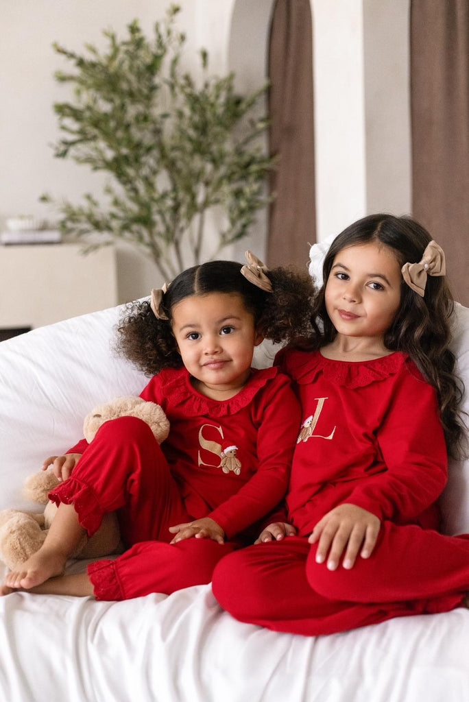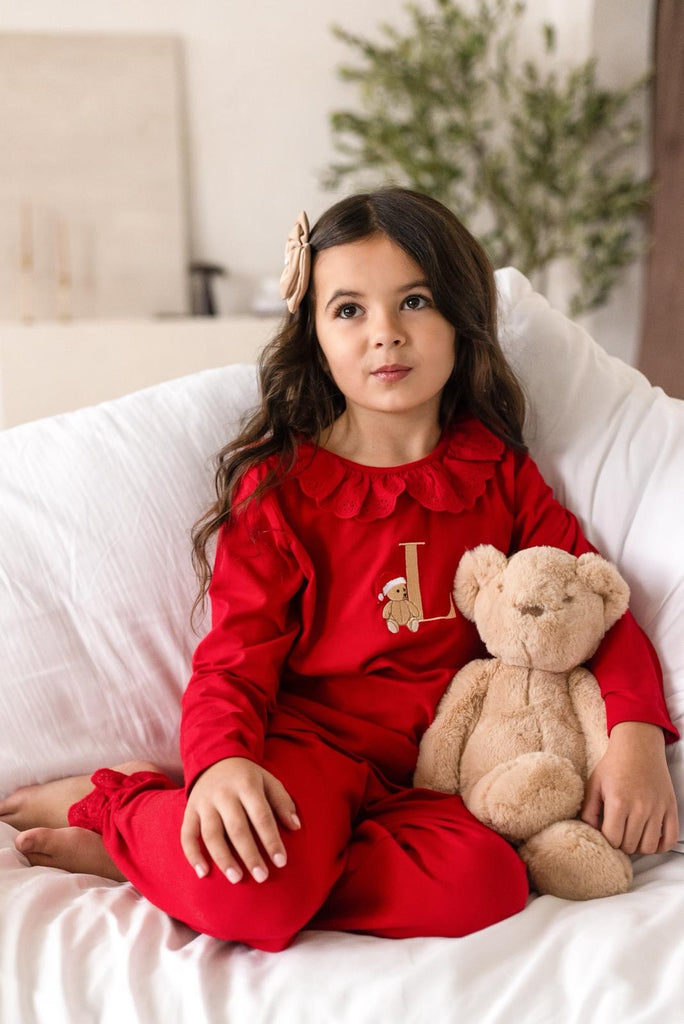 Girls Red Santa Teddy Bear Frill Pyjamas