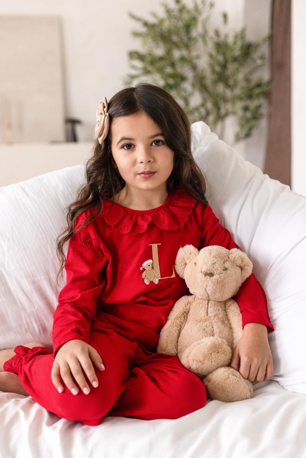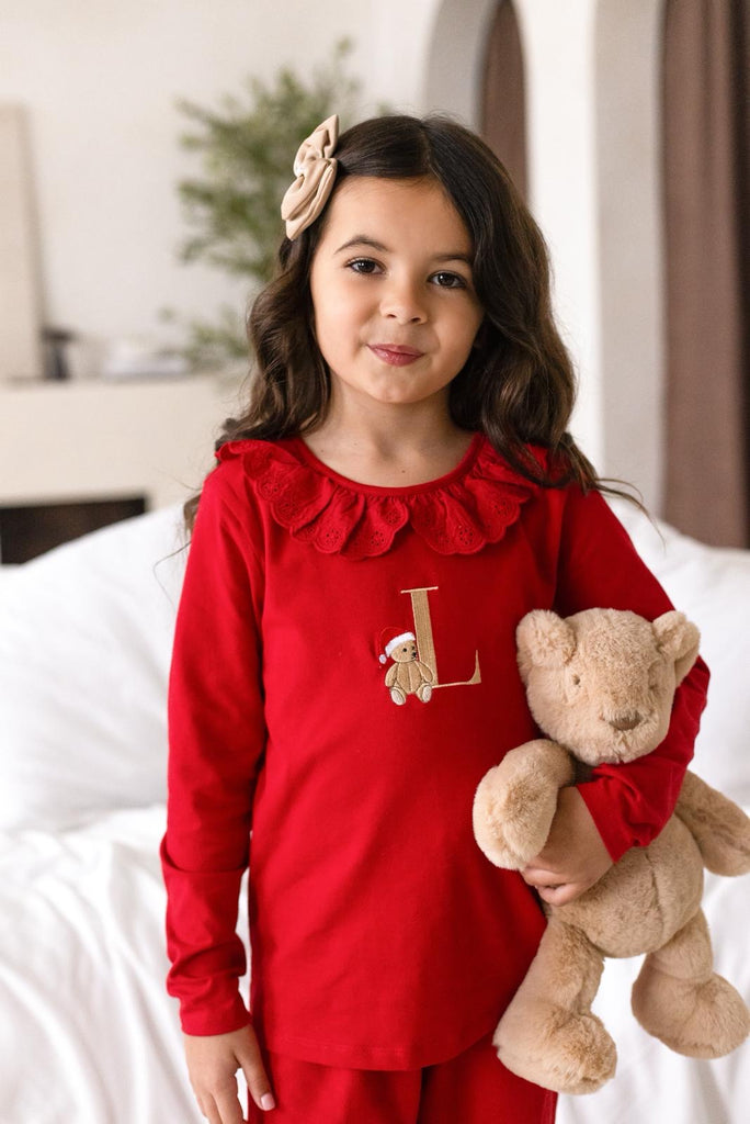 Embroidery is placed on the chest, the Santa teddy bear is on the pyjamas as standard with your little ones initial. Embroidery is one large initial only in gold.