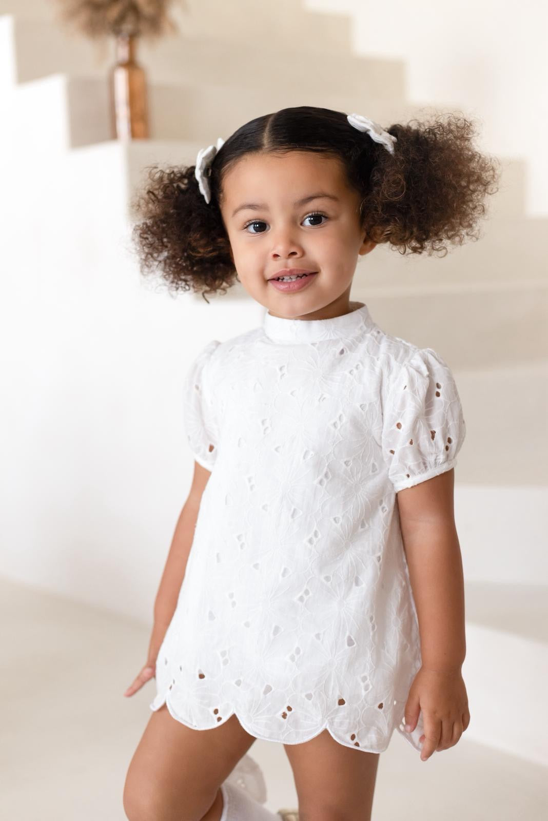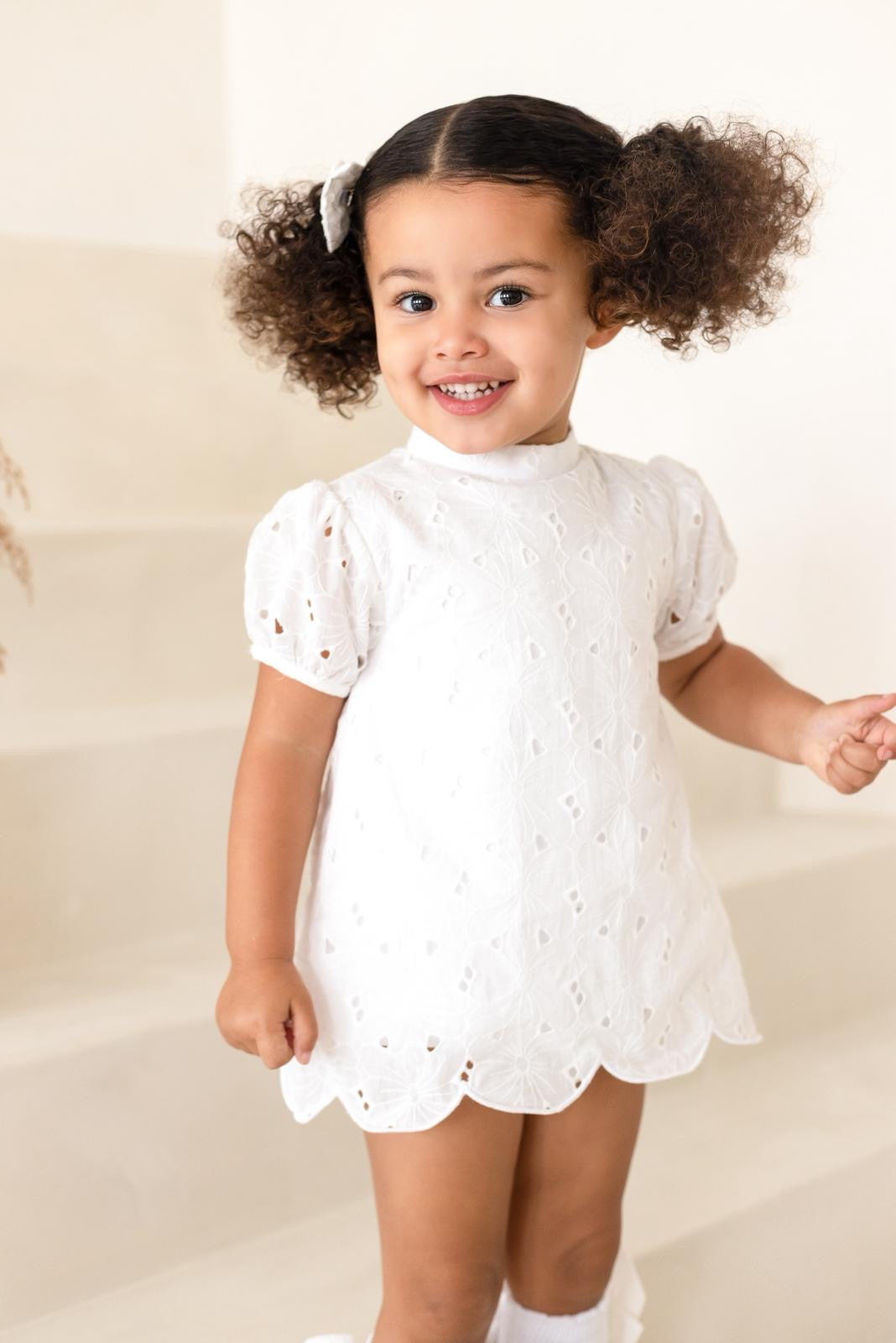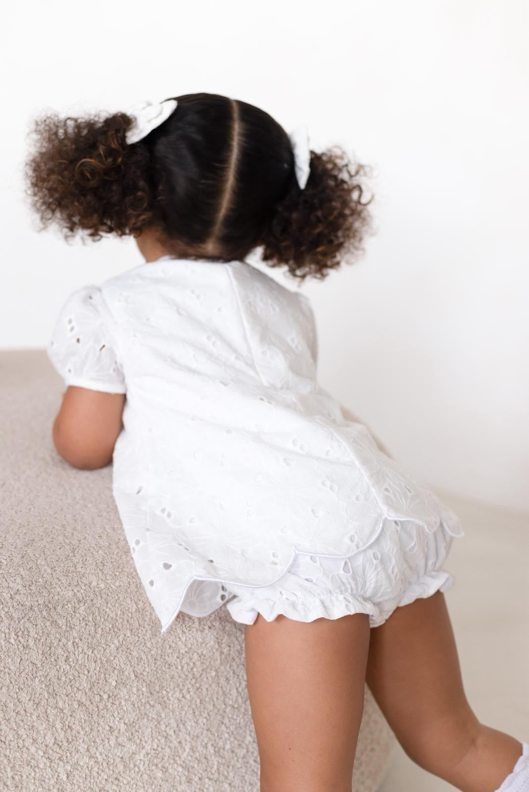 Here we have our first ever broiderie anglaise collection, this collection has been created to be a timeless design, with scalloped hems and floral patterns to create the ultimate spring/summer wear for your little one. This collection is super versatile, it makes for the perfect holiday outfit that can be super casual, order dressed up and paired with our matching accessories it can make the perfect occasion wear.