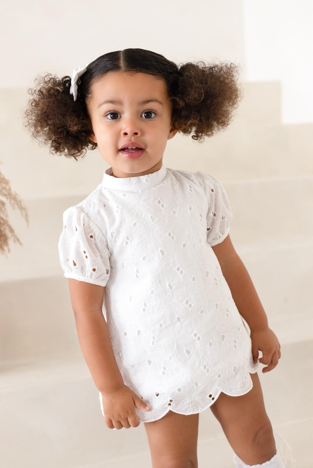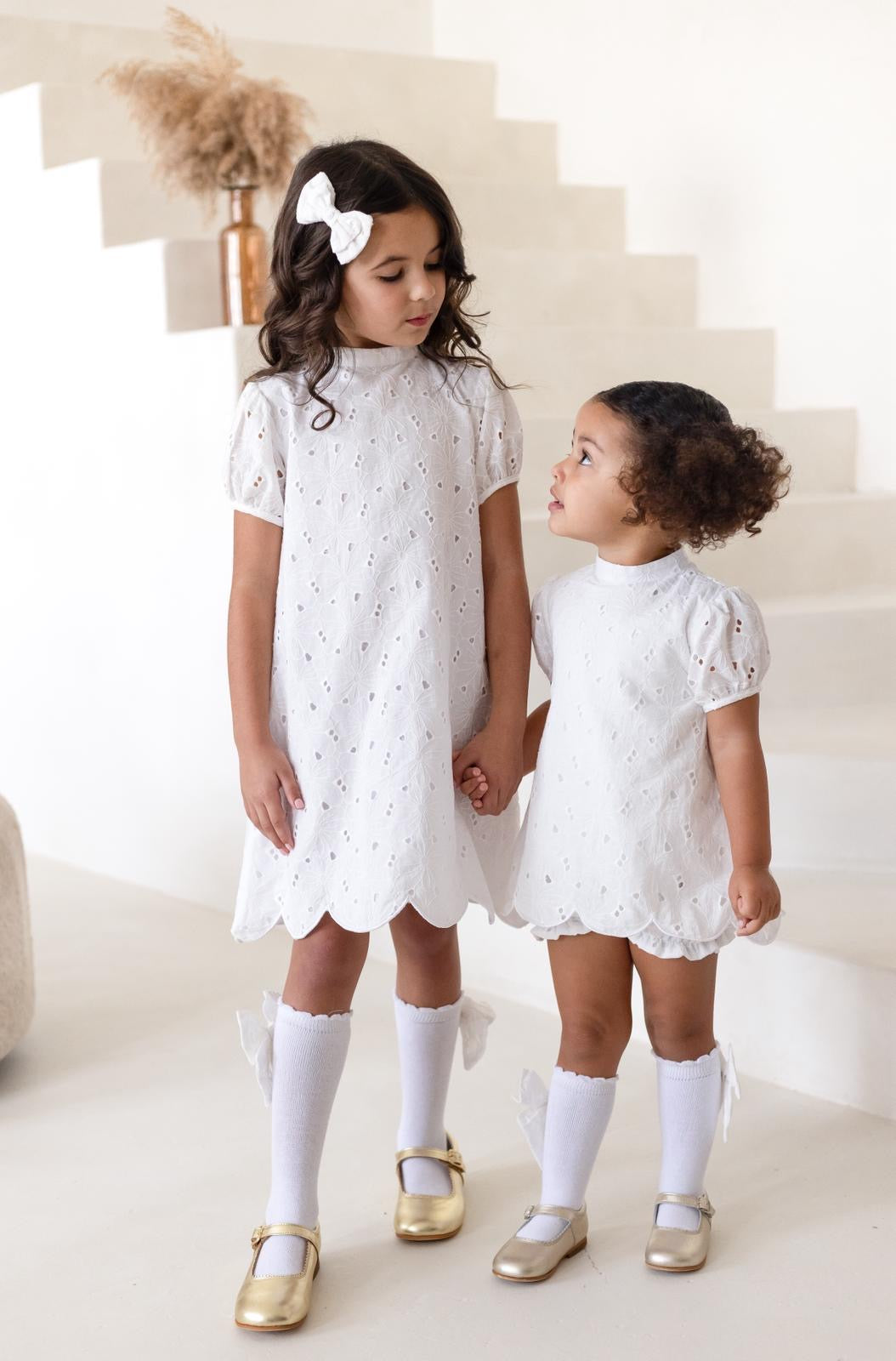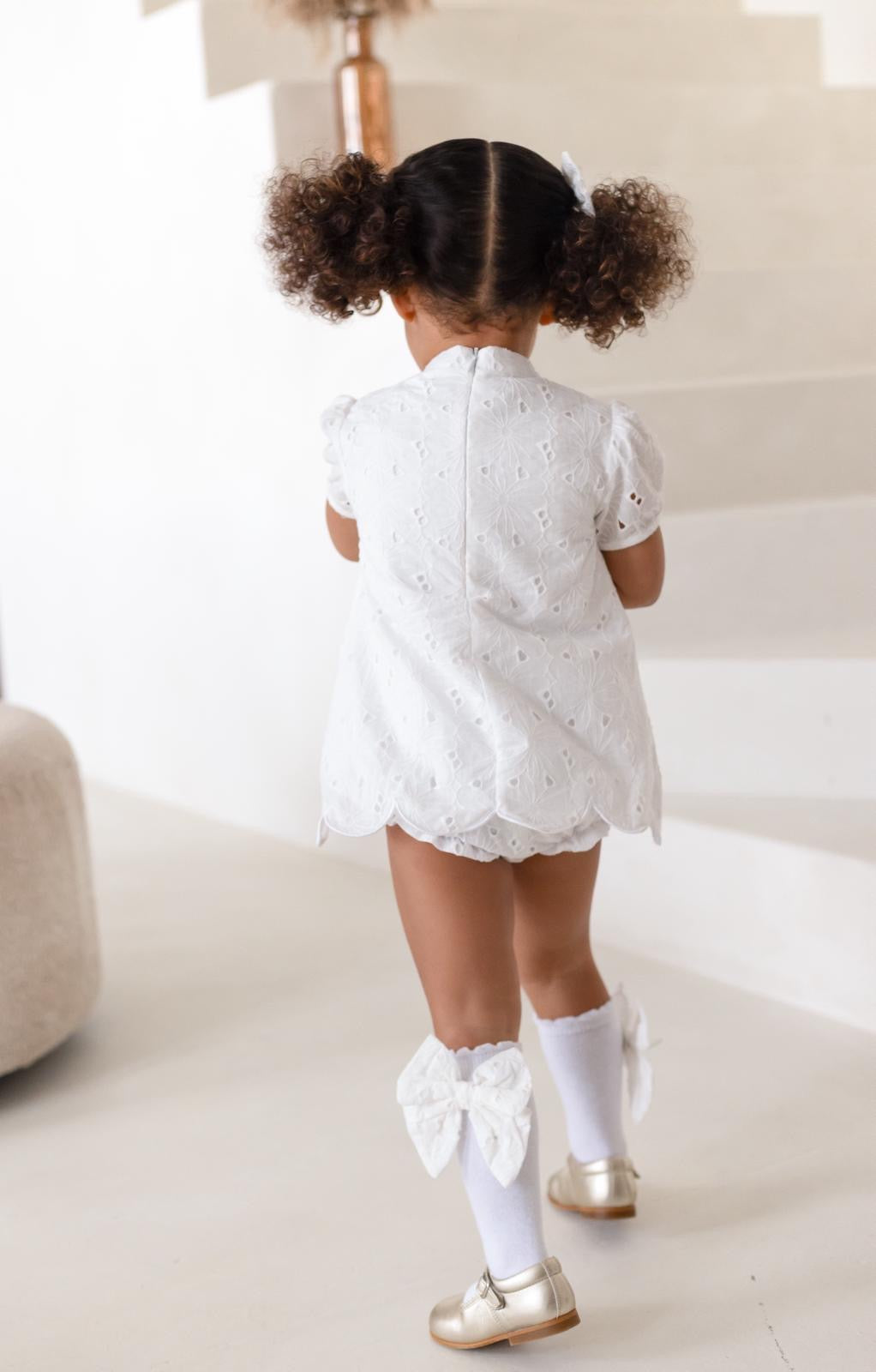 Here we have our first ever broiderie anglaise collection, this collection has been created to be a timeless design, with scalloped hems and floral patterns to create the ultimate spring/summer wear for your little one. This collection is super versatile, it makes for the perfect holiday outfit that can be super casual, order dressed up and paired with our matching accessories it can make the perfect occasion wear.