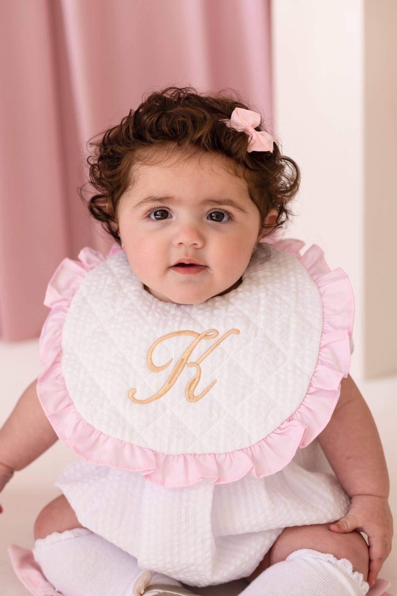 Girls White Personalised Seersucker Quilted Bib Trimmed With Pink