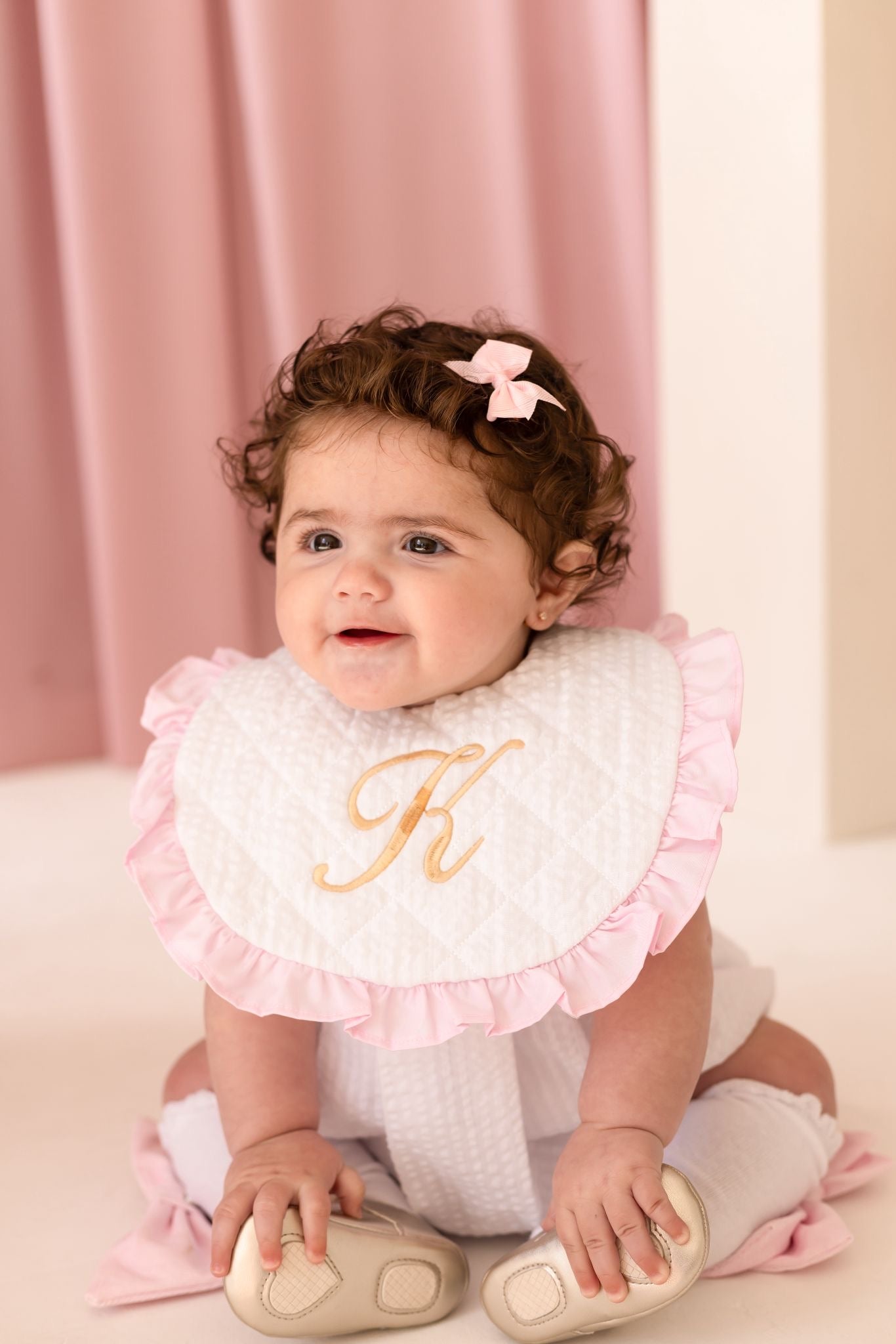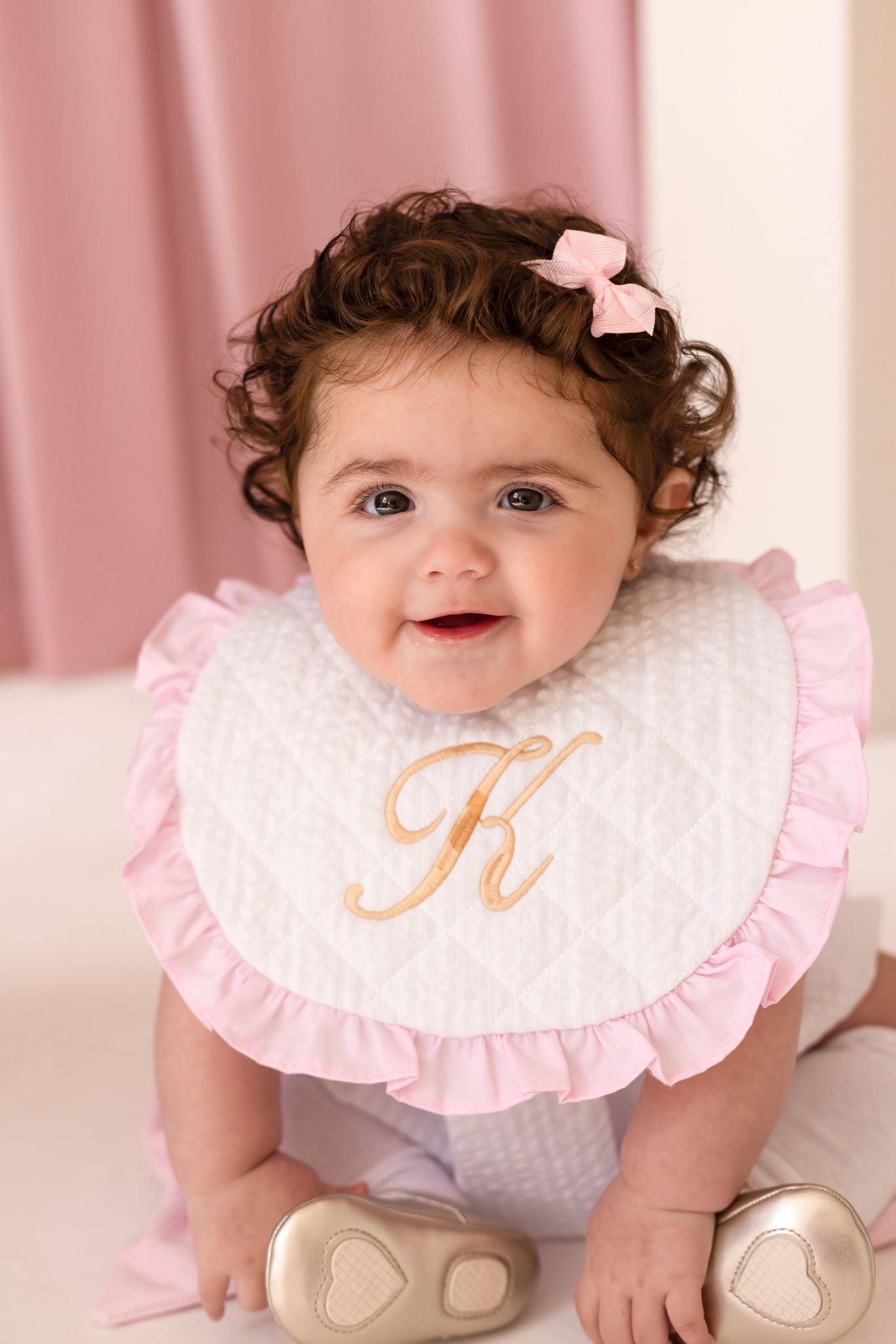 Embroidery is in our ballerina font in the centre of the bib, embroidery will be in pink or gold.