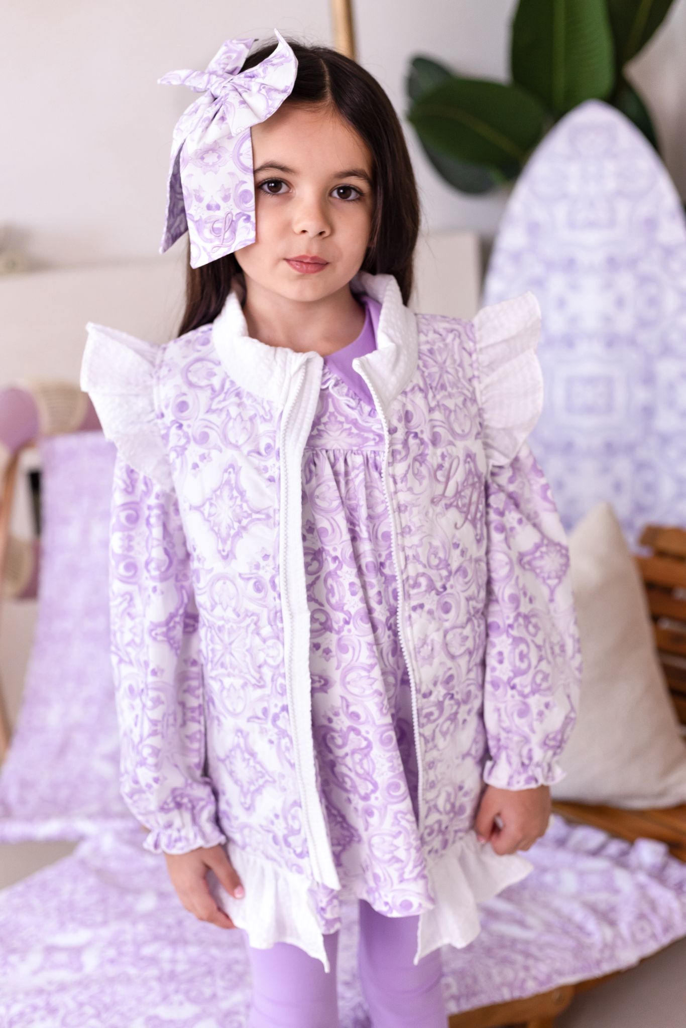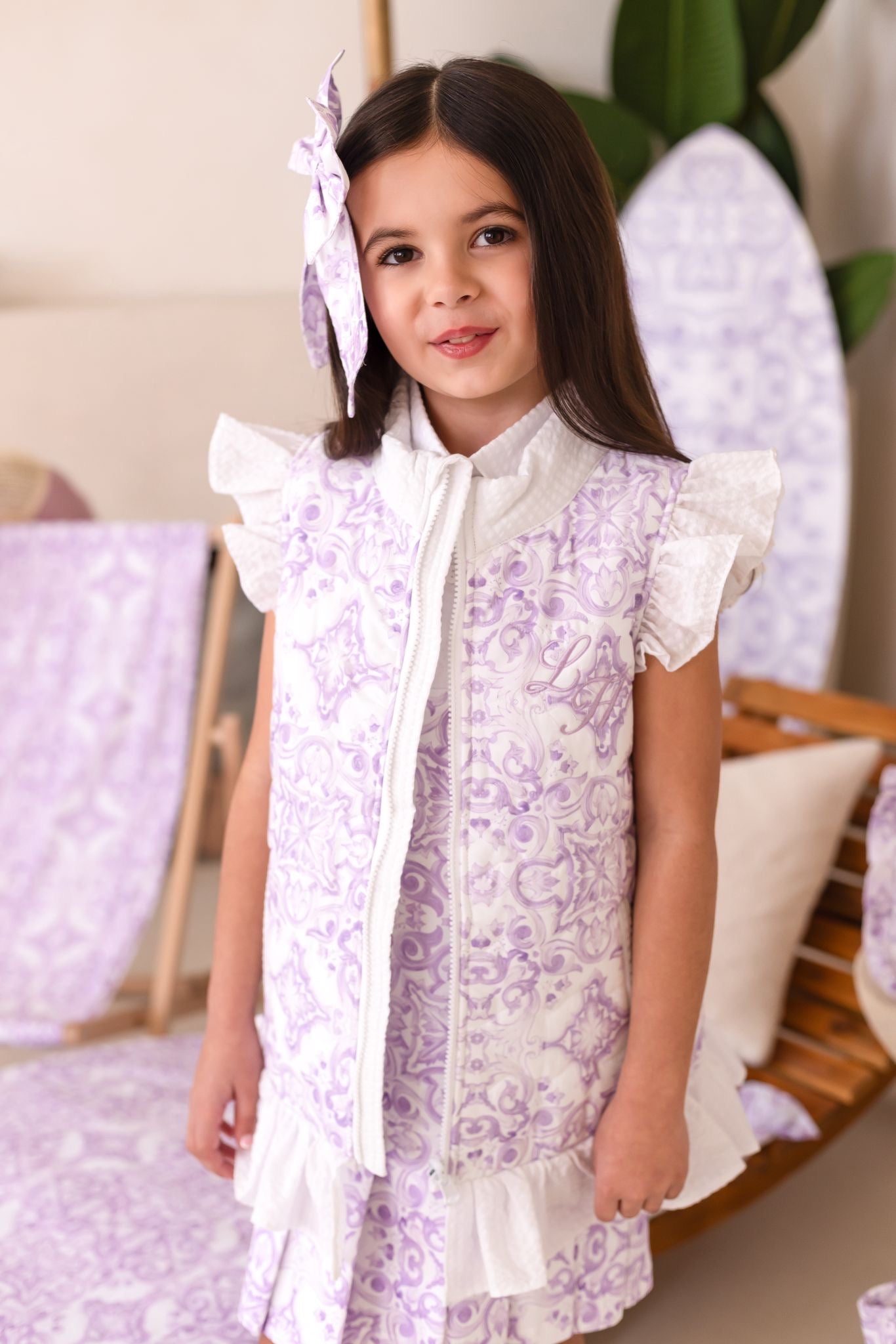Embroidery details: Embroidery is initials placed on the breast of the gilet in complementary lilac.