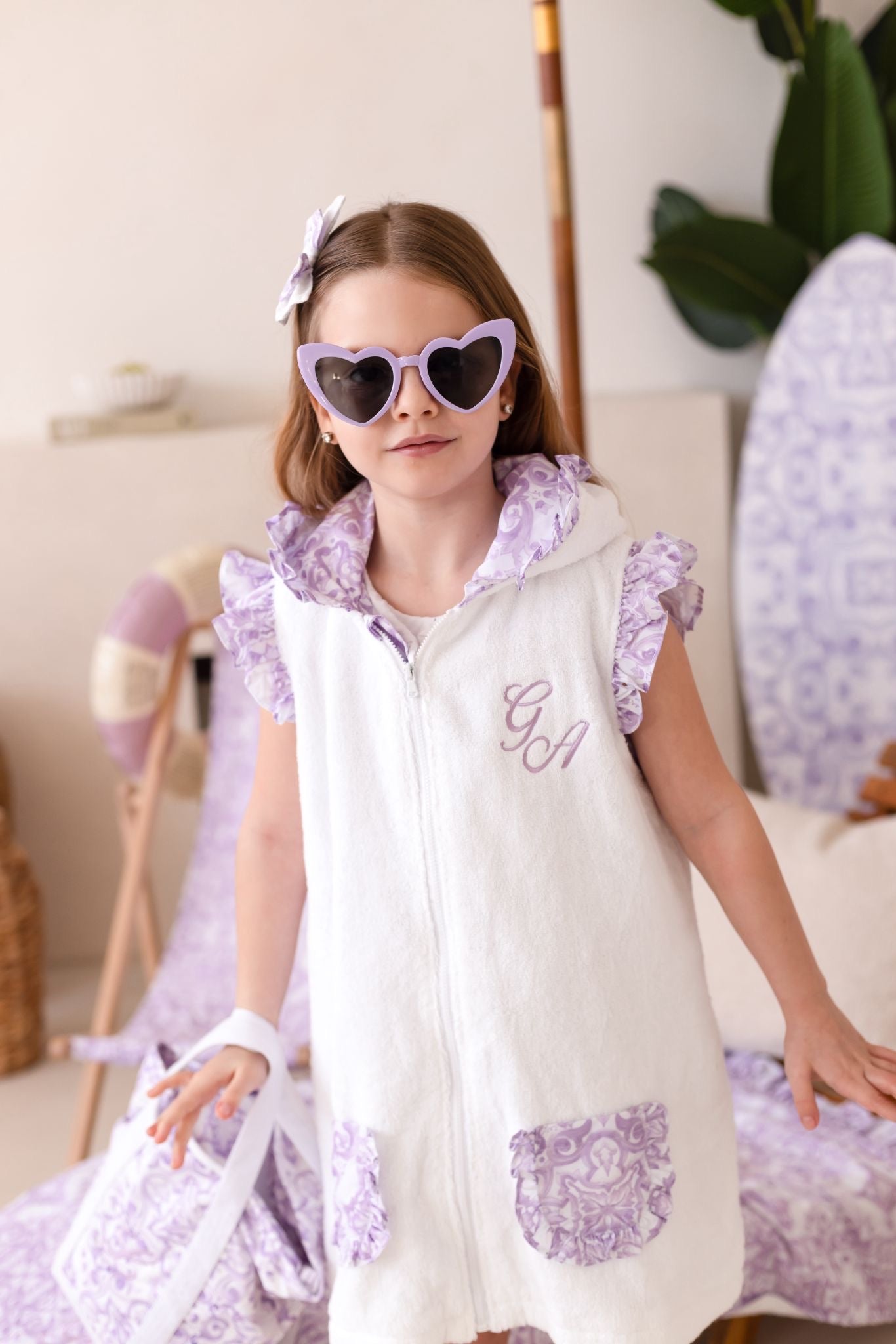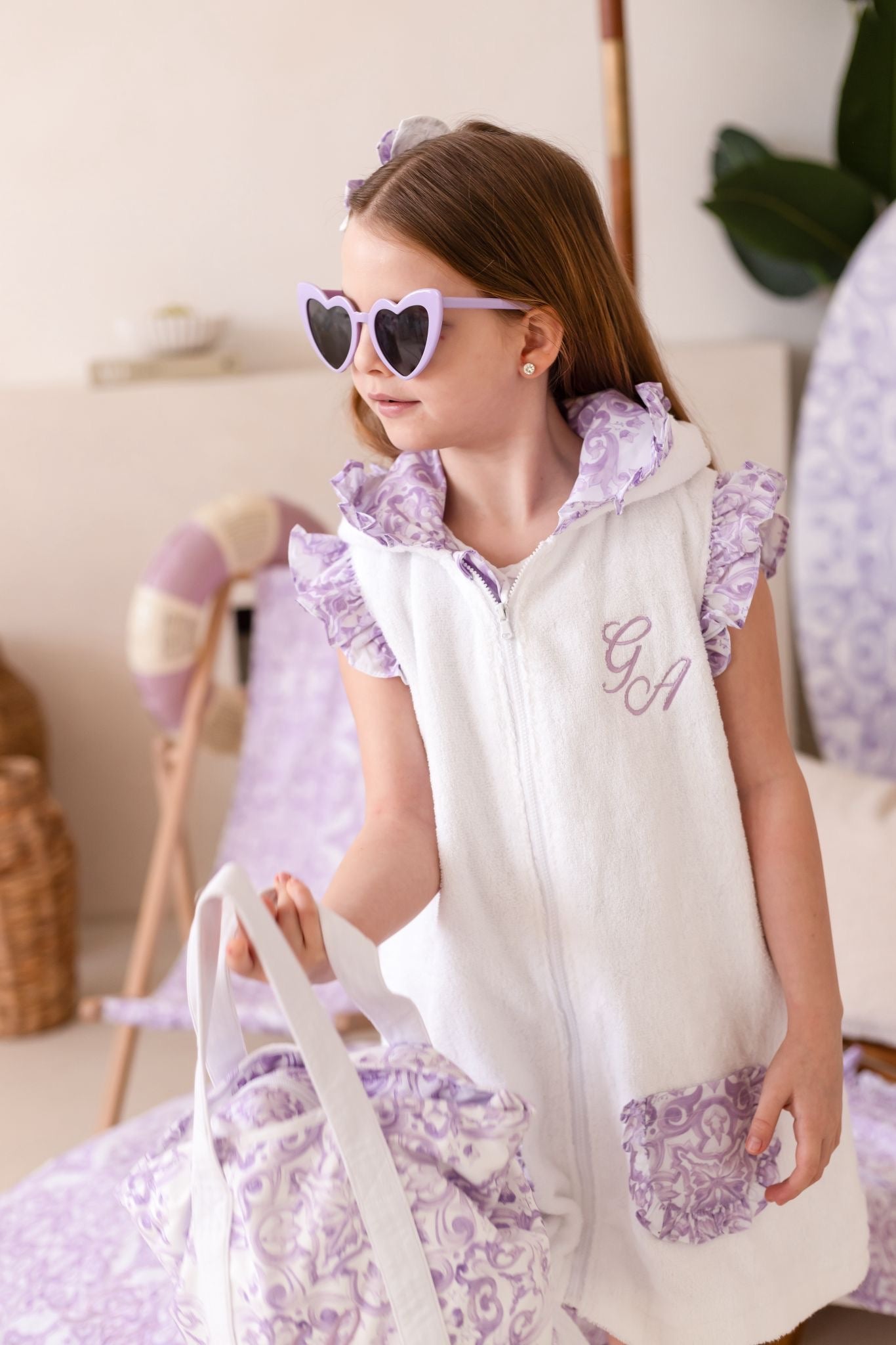 Embroidery details: Embroidery is name or initials placed on the breast of the towelling coverup in a complementary lilac.