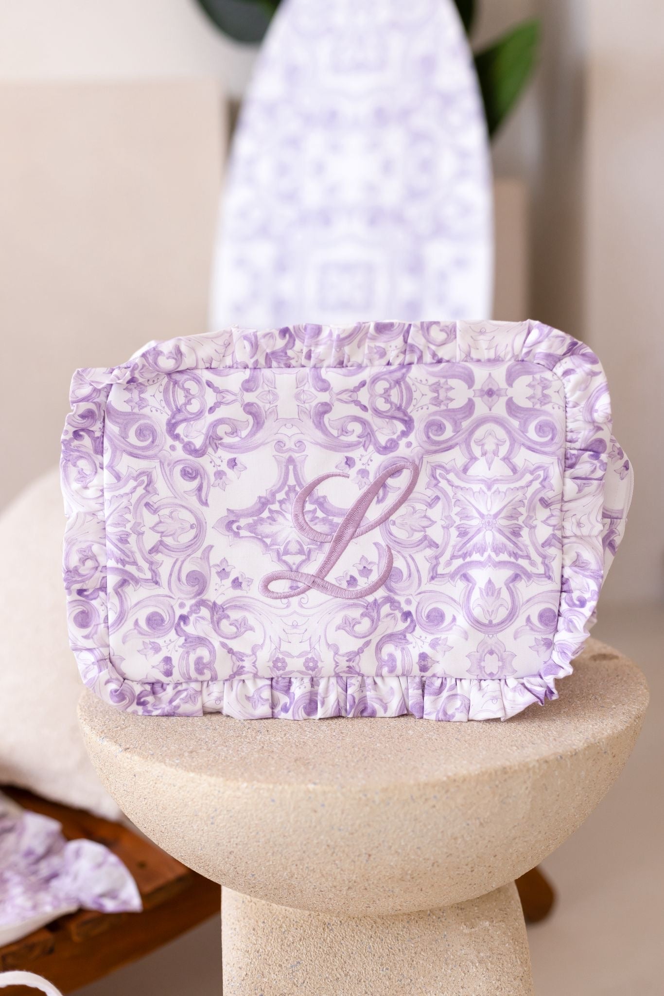 Embroidery details: Embroidery is one large initial placed in the centre of the pouch in a complementary lilac.