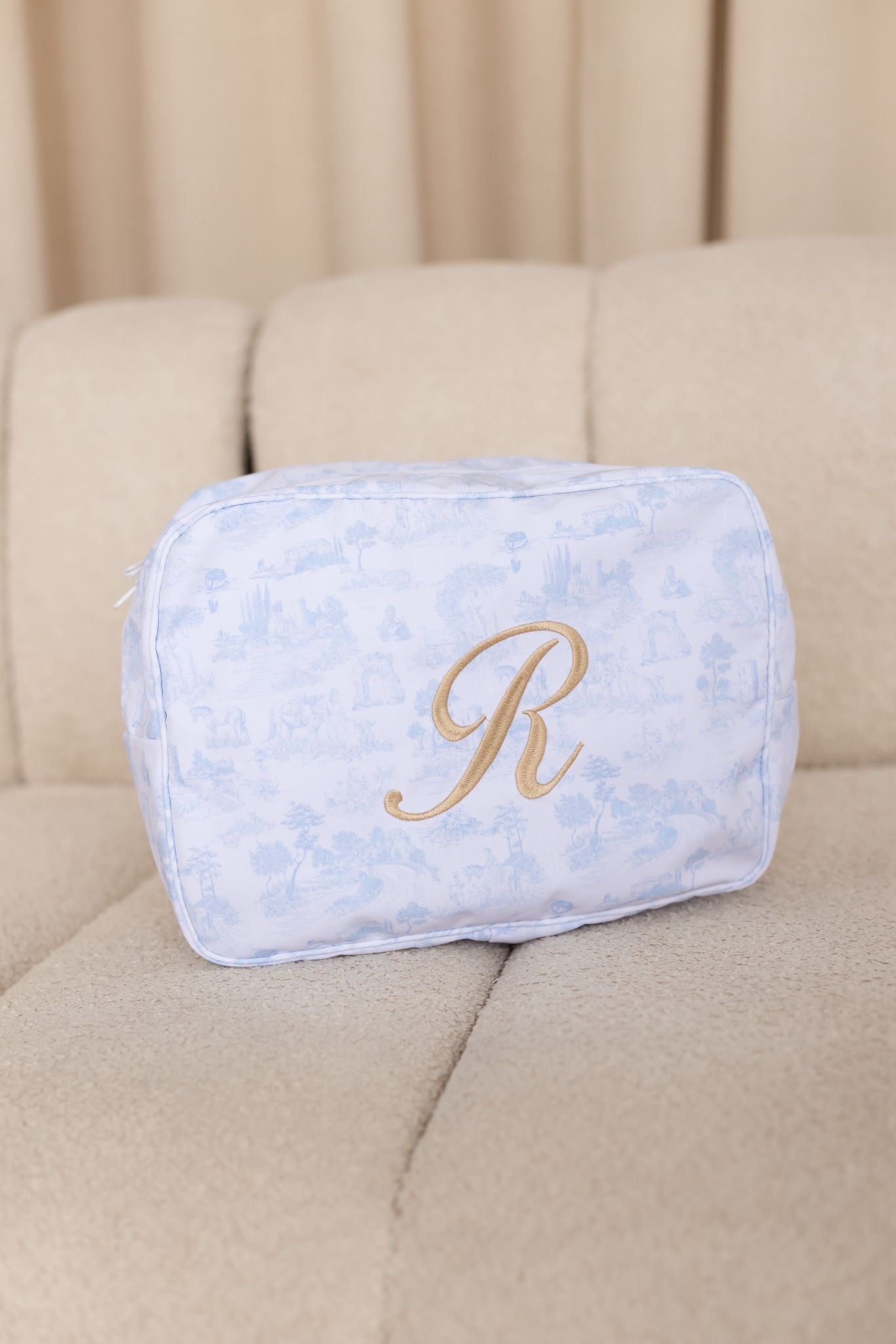 Embroidery details: Embroidery is initials in the centre of the pouch in gold.