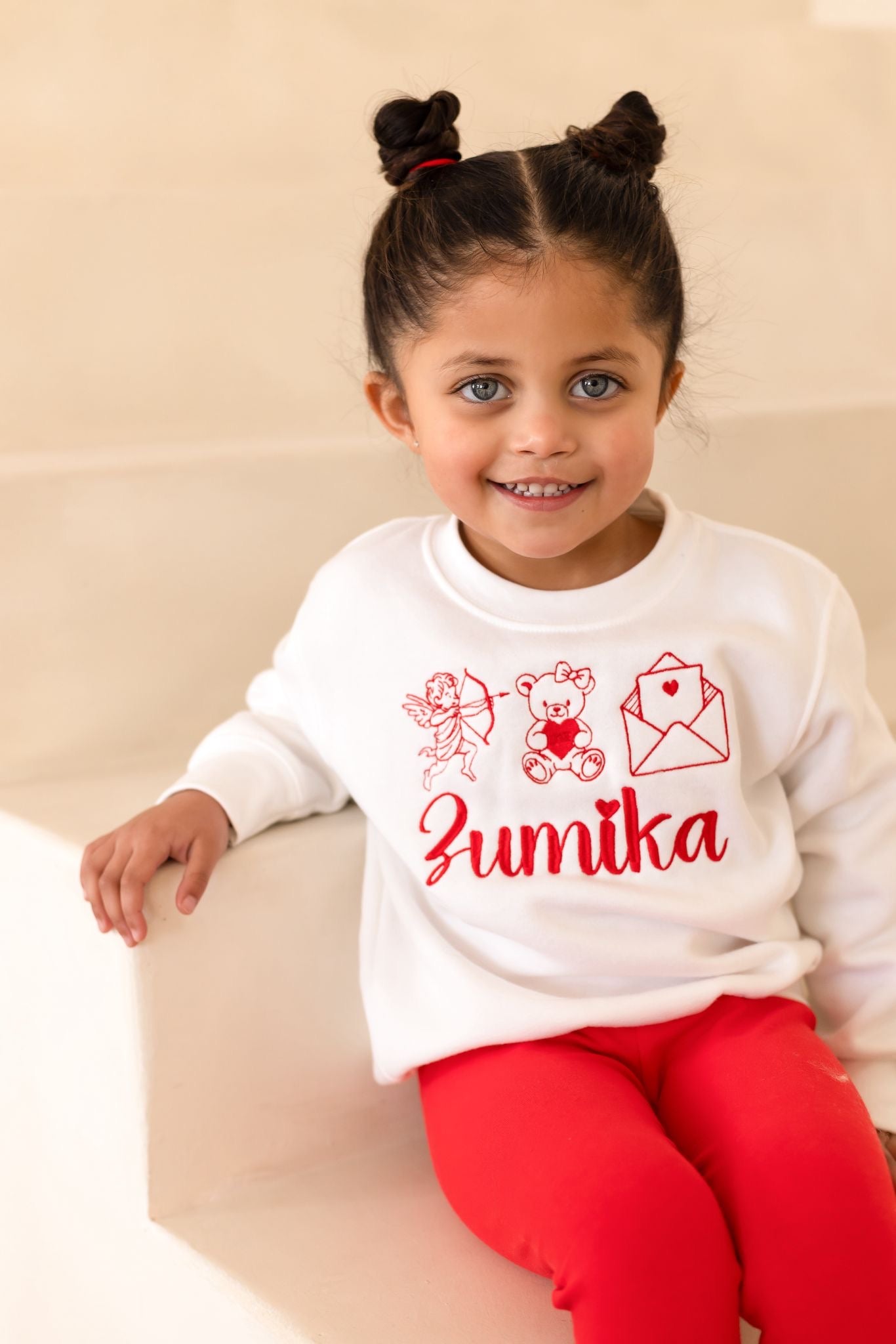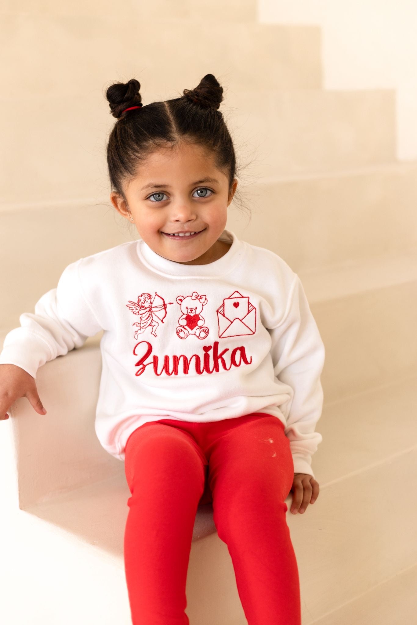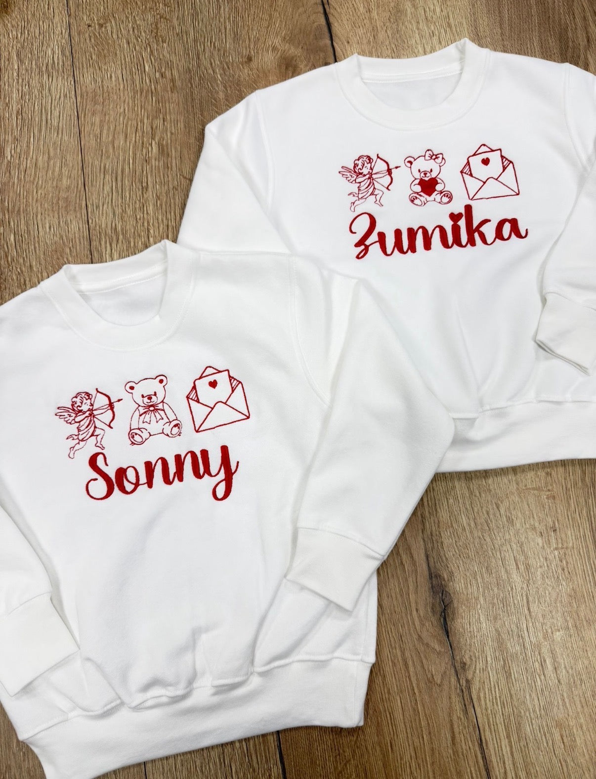 Embroidery is in our valentines design as pictured, with your little ones name under the design using our Valentines font. Embroidery is in a red.
